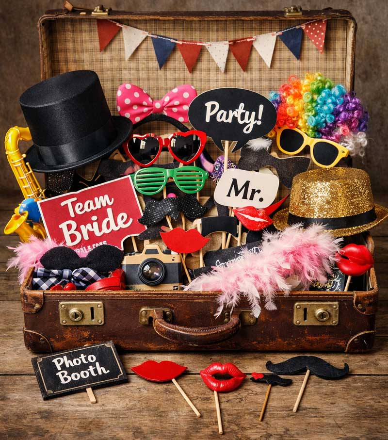 Für noch mehr Spaß auf deiner Feier kannst du optional ein Accessoires-Paket im Retro-Koffer dazubuchen. So entstehen noch kreativere und witzigere Bilder mit Hüten, Brillen, Schildern und weiteren Foto-Accessoires.